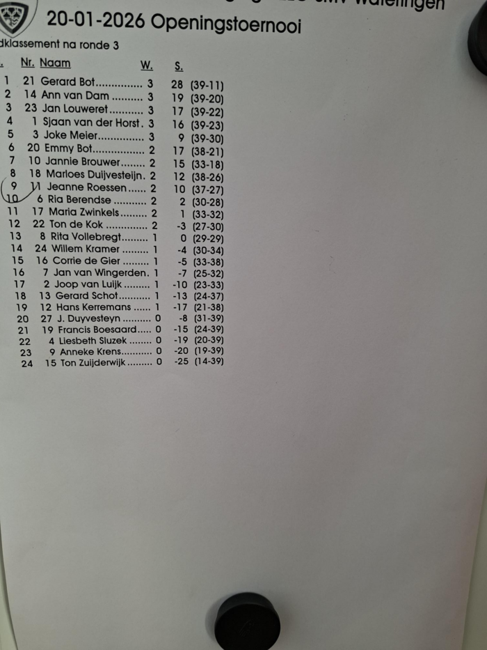 Jawel, met dit openingstoernooi dat op 21 januari 2025 is gespeeld is de opening van het toernooi jaar 2025 een feit. Het jaar 2024 was een goed toernooi jaar alleen de Ladys Day werd niet gespeeld door te weinig inschrijvingen. Maar ja wat wil je ook, een toernooi zonder mannen is als een bedrijf zonder vrouwen in het bestuur en een korfbalteam zonder zowel vrouwen als mannen. Gelukkig waren alle andere toernooien wel gespeeld met veel inzet en vooral plezier. Laten we daar dit jaar een voorbeeld aan nemen. Wat ik al eerder geschreven heb is dat het voor mij moeilijk is iets over het gespeelde toernooi te schrijven is, daar ik dan teveel met mijzelf bezig ben. Dat was dit openingstoernooi toch anders. Normaal weten we van te voren wie er waarschijnlijk in de prijzen zou vallen maar dat was dit toernooi toch net iets anders. Het waren niet alleen de bekende spelers. Dit had denk ik met liefde en beginners te maken. Laten we nu niet beginnen met te zeggen, die zogenaamde beginners hebben we laten winnen, dat is goed voor hun zelfvertrouwen. Dat was zeker niet het geval, wat bedoel je dan hier nu weer mee te zeggen zou je kunnen denken. Het volgende gebeurde. Ons gewaardeerde lid Hans van Gaalen had zich voorgenomen een prijs mee naar huis te nemen, Nee niet voor zichzelf maar voor zijn vrouw Annemiek waarvan wij weten dat die thuis is na een knie operatie. De liefde is hier zo groot dat dit Hans tot grote hoogte bracht. Dat het de eerste prijs zou worden was voor hemzelf waarschijnlijk ook een verrassing. Nu wat die beginners betreft. Ik weet niet of het echt beginners zijn maar ze speelde dacht voor het eerst mee met een toernooi. Deze twee dames, ik noem ze hierbij M en M naar die heerlijke snoepjes, speelde beide zeer goede partijen. Of je wint of verliest heeft natuurlijk ook met je maat en tegenstanders te maken maar zij hebben zich uitstekend verweerd. Deze dames met de namen Marloes en Maria, namens een ieder van harte gefeliciteerd. Zo zie je maar dat een toernooi altijd een of meerdere verrassingen met zich mee brengt. Verder was alles weer als vanouds, Cees en Liesbeth bedankt voor de organisatie en Sjaan en Alice bedankt voor het verzorgen van de innerlijke mens.