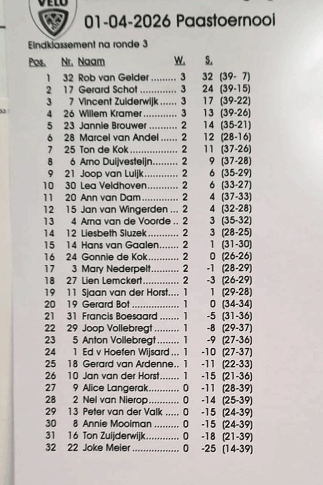 Nu dan echt als laatste weer de uitslag van het toernooi waar deze keer 36 leden op in hadden geschreven. Volle bak dus.